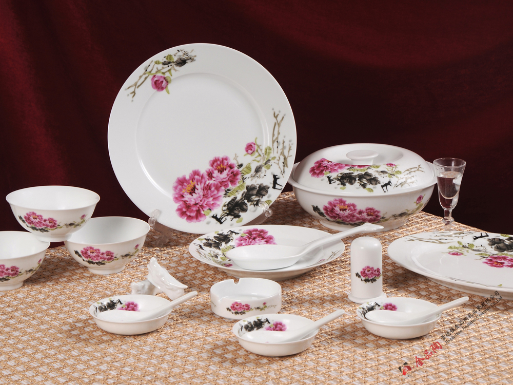 民族碗*10件,8"汤盘*10件,针匙*10件,筷架*10件,3"碟*10件,品锅*1套,10"平盘*1件,12"鱼盘*1件,牙签筒*1件,烟灰缸*1件,饭匙*1件。