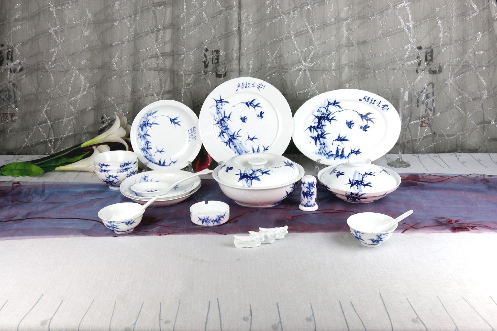 4.5"直口碗*10件,8"窄边汤盘*10件,针匙*10件,筷架*10件,3"碟*10件,和合器*4套,品锅*1套,10"平盘*1件,12"鱼盘*1件,牙签筒*1件,烟灰缸*1件,饭匙*1件。