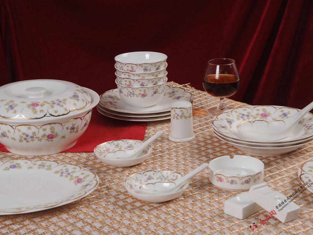 金钟碗*10件,针匙*10件,8"汤盘*6件,8"平盘*4件,方形筷架*10件,3"碟*10件,品锅*1套,10"平盘*1件,12"鱼盘*1件,饭匙*1件,牙签筒*1件,烟灰缸*1件