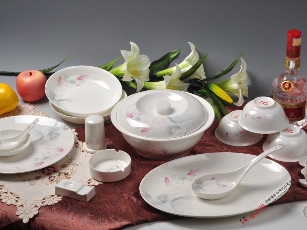 反扣碗*10件,针匙*10件,7.5"饭碗*6件,8"月光平盘*4件,筷架*10件,3"碟*10件,品锅*1套,10"平盘*1件,12"鱼盘*1件,饭匙*1件,牙签筒*1件,烟灰缸*1件